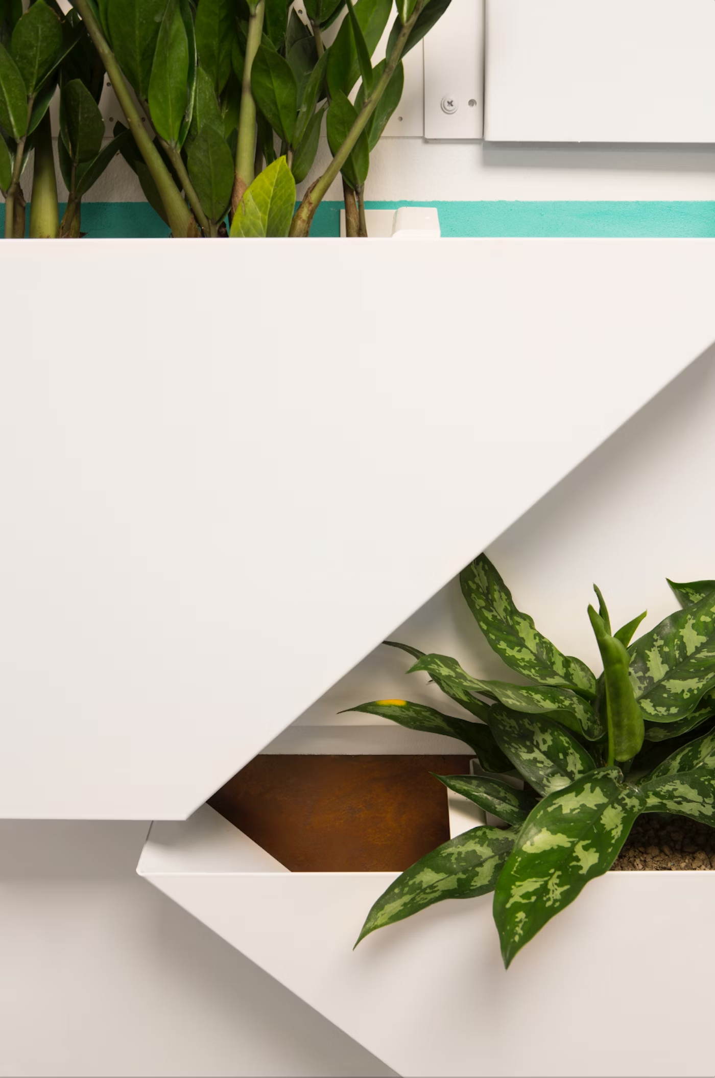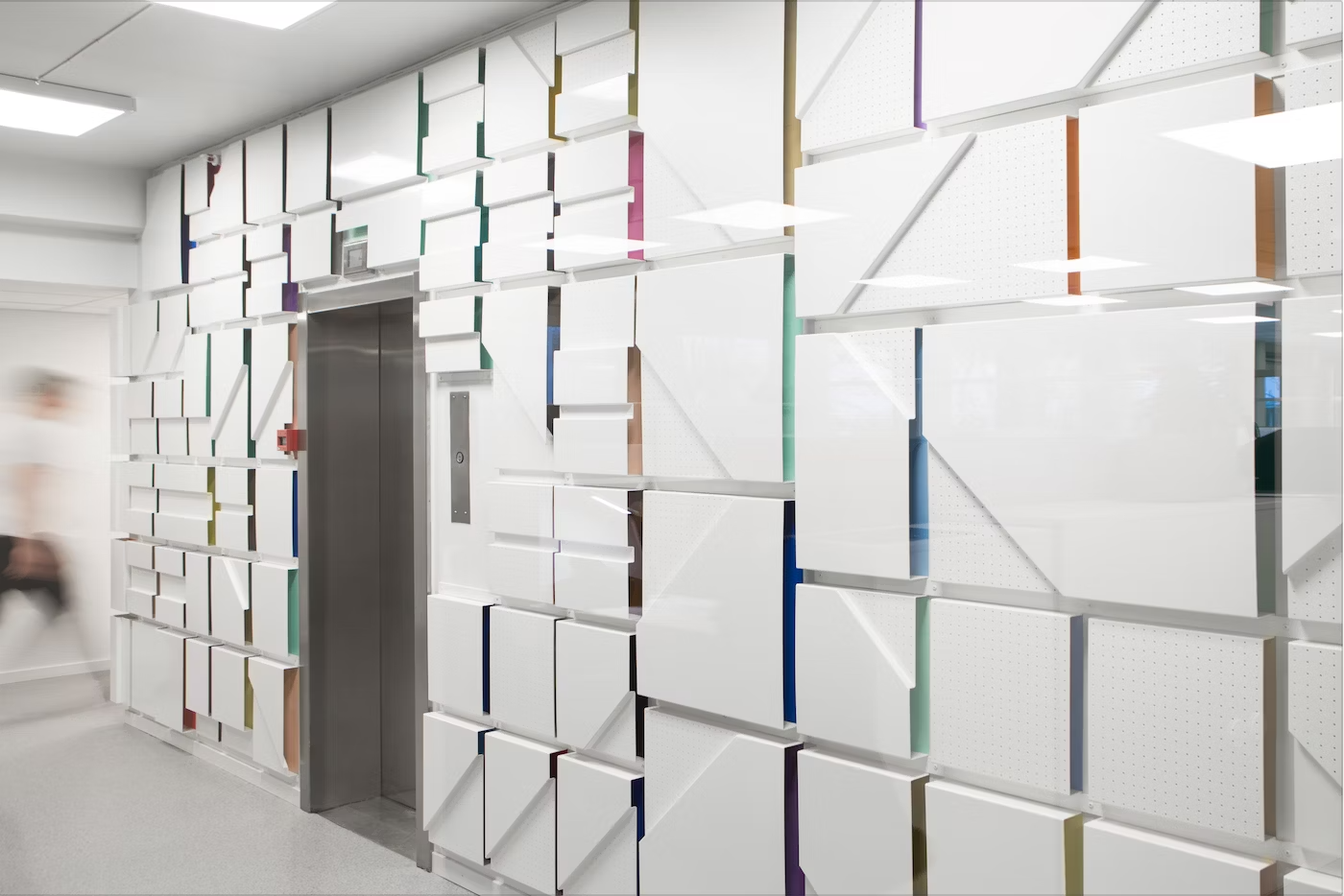 Utsmykningen er et dekorativt innslag i kontorlandskapet som er bygget på et fleksibelt modulært system. Designet gir assosiasjoner til bylandskapet og tolkes gjennom en innovativ bruk av aluminiumsprofiler. Dette er en godt gjennomtenkt løsning med mange muligheter og som lar seg utvikle for å skape komponenter for oppbevaring eller skilting.