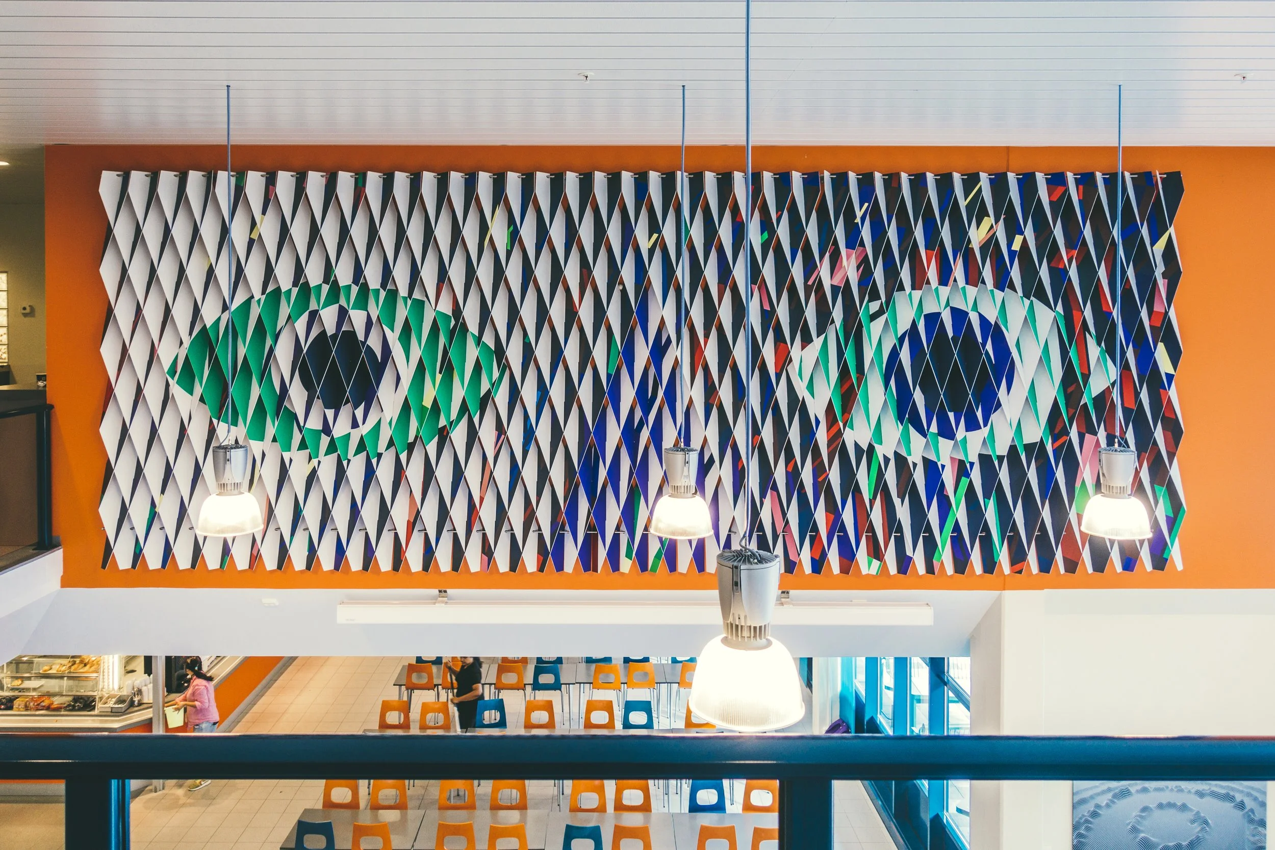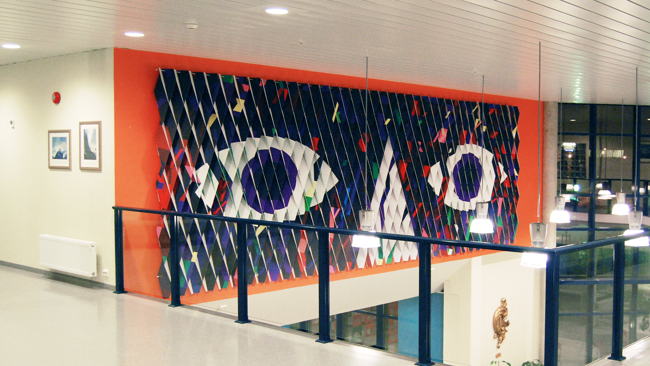 For å gjøre aktiviteten i rommet til en del av opplevelsen av kunstverket ble det montert to ulike illustrasjoner på hver sin side av et sammenflettet relieff.